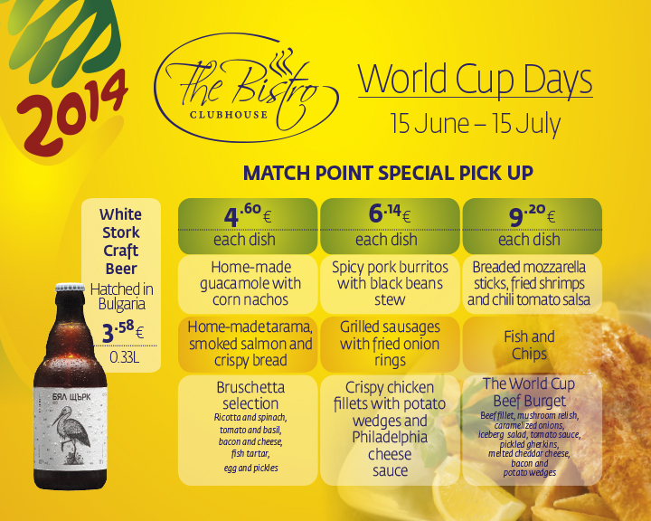 Until the 15th of July at the Clubhouse BISTRO our guests and Soccer fans can enjoy a special menu of dishes inspired by the competing teams.  Soaked in the football spirit our culinary team is matching the World Cup action with some of the best pick- up foods. Do not miss out to taste our Home-made guacamole with corn nachos (Mexico), Bruschetta selection (Italy), Fish and Chips (England) and The World Cup Beef Burger.