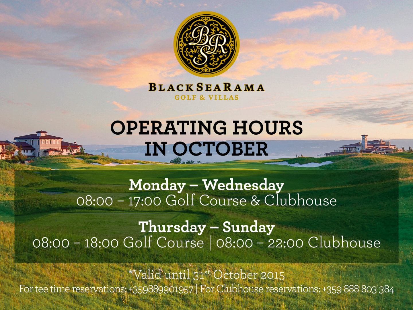 We would like to inform You that until the end of October 2015 there are new Operating Hours of the Golf Course and the Clubhouse.